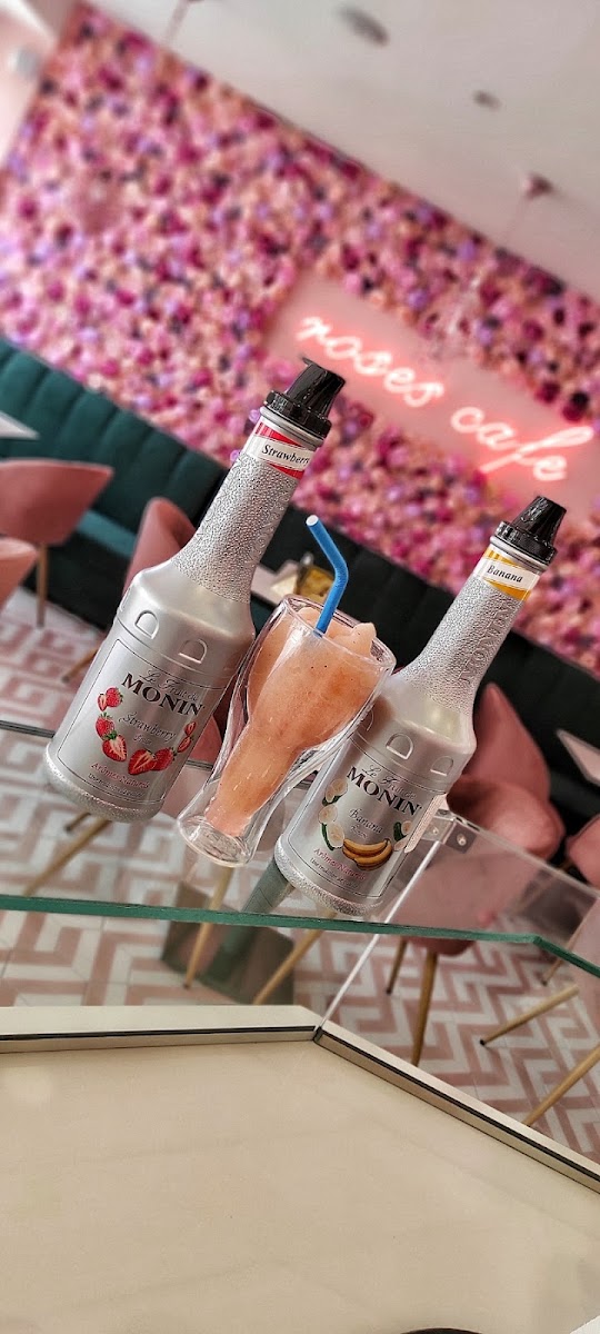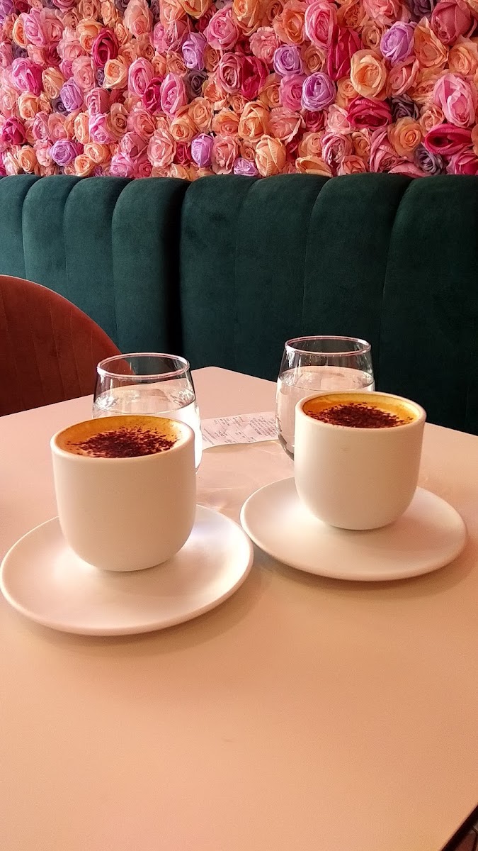 As you step inside, you are greeted by an enchanting interior adorned with a stunning wall full of faux roses, complemented by classy velvet furniture that radiates a warm and inviting atmosphere. Every corner of Roses Cafe speaks to a thoughtful design aesthetic that creates a perfect backdrop for leisurely hours spent sipping coffee and chatting with friends.